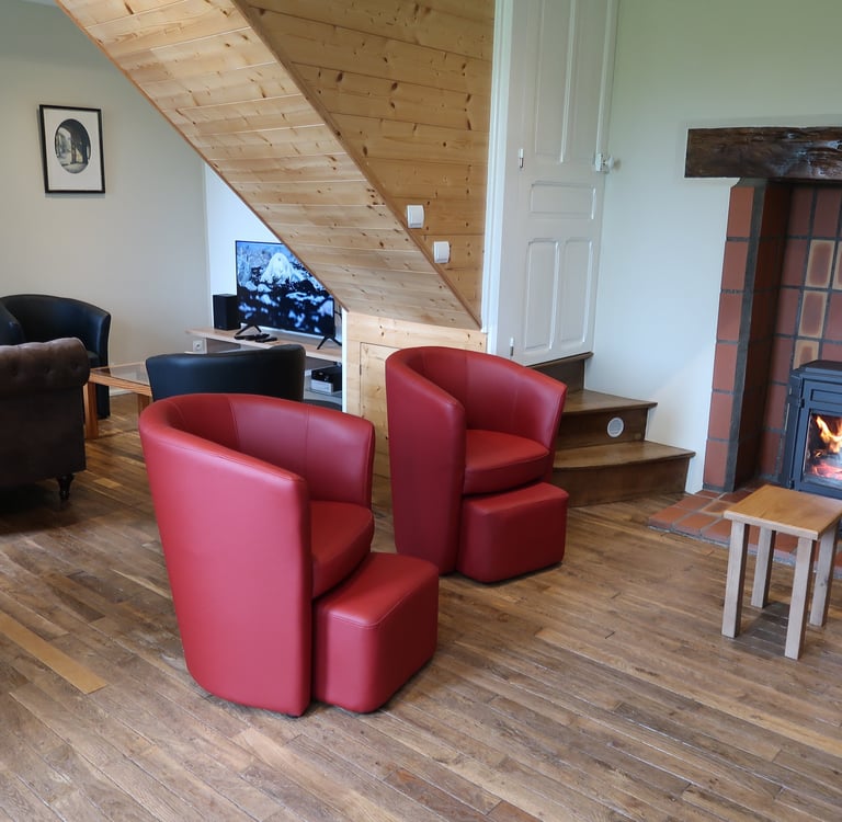 Espace de vie de 4*6 mètres avec poêle à bois de 8kw et espace TV